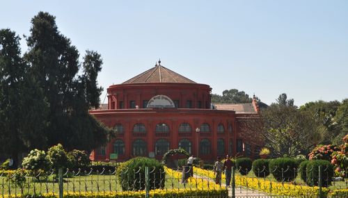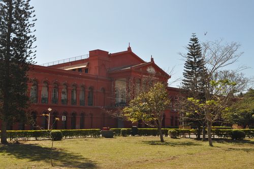 Le chauffeur m'arrête bientôt en face du Sheshadri Iyer Memorial (Central Library)(photo ci-dessous). Cet édifice fut construit en 1915 dans un style européen classique avec des colonnes toscanes et carinthiennes, en l'honneur de Sir K.Iyer Sheshadri , diwan de l'état de Mysore entre 1883 et 1901, alors considéré par beaucoup comme le créateur du Bangalore moderne. D'origine persane, le nom de Diwan (que l'on prononce aussi divan, cette longue banquette que l'on trouvait alors dans les salles du conseil) signifiait écrivain et plus exactement rédacteur des comptes. Sir K.Iyer Sheshadri fut le deuxième diwan de l'état de Mysore après la réinstallation de la dynastie Wodeyar en 1881. Ce grand serviteur de l'état est à l'origine de Kolar Gold Fields , de la construction de l'hôpital Victoria (Bangalore), de la fondation de l'Institut indien de la Science et de la création du jardin botanique Lalbagh. Ce bâtiment néo-classique, recouvert de rouge pourpre abrite de nos jours une bibliothèque publique , d'une surface de 300 m², qui reçut en l'an 2000 le prix de la Fondation bibliothécaire Raja Rammohan Roy, et ce, afin de récompenser la « meilleure bibliothèque de l'Inde » pour sa contribution dans la diffusion des connaissances. La bibliothèque comporte entre autre une section en braille, dédiée aux non-voyants. En face de l'édifice, se trouve une superbe roseraie.