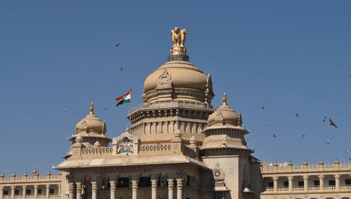 A côté d'Attara Kacheri, voici Vidhana Soudha, un imposant édifice en granit et en porphyre. Il abrite le Secrétariat et le Parlement du Karnataka. Construit en 1956 après le transfert de pouvoirs de la Dynastie Wodeyar au gouvernement central, il fut conçu par Kengal Hanumanthaiah, le Premier Ministre de l'époque qui souhaitait un bâtiment à l'image de la puissance et de la dignité du peuple. Il est couronné par un dôme de 20 mètres de haut, surmonté par le lion dAshoka, à quatre têtes, symbole de l'état indien. Avec ses jharokha rajasthani (sorte de balcon inséré dans le mur et couramment utilisé dans l'architecture indienne), ses piliers indo-saracéniques et ses autres éléments décoratifs, le Vidhana Soudha illustre parfaitement le style néodravidien du Bangalore d'après l'indépendance. Les boiseries de l'intérieur ( tout particulièrement la porte en bois de santal du Cabinet Room ainsi que celle en bois de rose de Mysore du Speaker's Chair) sont magnifiques.