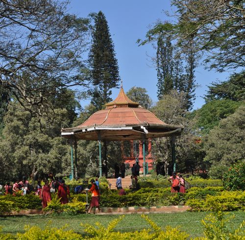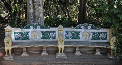 Il y a de nombreuses statues dans le parc Cubbon. Je m'arrête quelques instants en face de celle de Chamarajendra Wodeyar (visible plus haut) à côté de laquelle je trouve un banc en céramique, orné de lions (photo ci-dessous). Non loin de là, un kiosque à musique octogonale en fer forgé (deuxième photo) se tient au milieu d'un jardin. Il accueillit autrefois de nombreux musiciens et orchestres du monde entier. En arrière plan du kiosque, on peut distinguer l'aquarium du parc, un bâtiment octogonal. Il est l'un des plus grands aquariums en Inde et on peut y voir des poissons indigènes, exotiques et ornementaux.