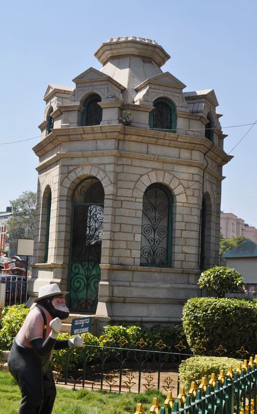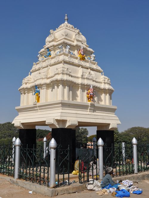 Non loin de là, je monte à la Tour Kempe Gowda (ci-dessous) en hommage à Bengalooru Kempe Gowda, le fondateur de Bangalore. Dès son plus jeune âge, il fait preuve d'autorité, et pense à étendre le royaume afin de préserver Hindu Dharma. C'est sous un arbre du village de Shivasamudra qu'il conçoit une ville pratique qui deviendrait capitale. Il y prévoyait la construction d'un fort, d'un réservoir d'eau, d'un cantonnement et de temples ainsi que les artisans et commerçants pour s'y épanouir. Il reçut en 1537 l'autorisation de Achyuta Deva Raya, Empereur de Vijayanagara et entreprit la construction de Bangalore. La capitale de l'état fut ainsi transférée de Yelahanka à la nouvelle cité.