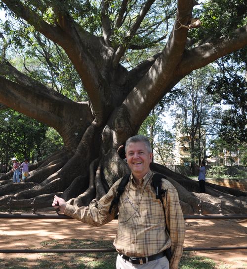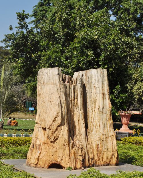 Chaque mois, les deuxième et quatrième weekends, est organisé le spectacle de Janapada Jaatre (fête folklorique). Celui-ci permet d'apprécier danses folkloriques, pièces de théâtre et concerts interprétés par des troupes originaires de tout l 'état du Karnataka , avec costumes et instruments traditionnels. Un kiosque à musique (ci-dessous) s'élève dans l'alignement de la maison de verre, qui constitue une attraction supplémentaire pour les visiteurs. En marchant tout droit, j'atteins bientôt un jardin de sculptures végétales (deuxième photo) ou les familles indiennes viennent se faire photographier. A gauche de ce jardin, j'aperçois un gigantesque arbre à soie (Silk cotton tree) ou arbre Ceiba, devant lequel je prends moi-même la pause (troisième photo). Symbole sacré de la mythologie maya, cet arbre tropical que l'on trouve au Mexique, aux Etats-Unis, en Amérique du Sud, en Afrique de l'Ouest et aux Caraïbes, peut atteindre jusqu'à soixante dix mètres de haut et son tronc peut dépasser les trois mètres d'épaisseur. Dans ce même parc se trouve aussi un arbre fossilisé (quatrième photo), vieux de 20 millions d'années. Ce conifère pétrifié provient de la collection du parc national d'arbres fossilisés de Tiruvakkarai.