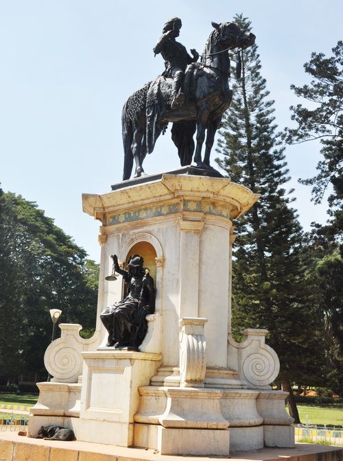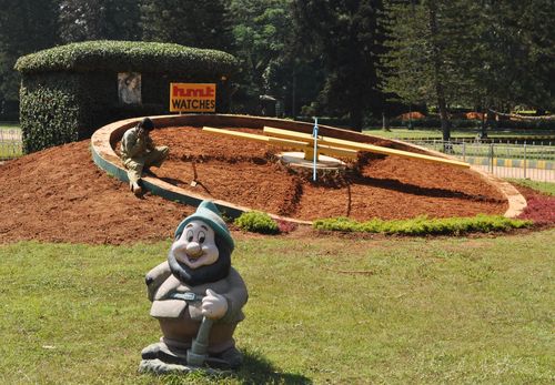 Une horloge florale (photo ci-dessous) offre en temps normal une touche colorée en face de l'une des entrées du parc. Malheureusement, je n'y trouve aucune fleur mais seulement un jardinier affairé à refaire les parterres et un nain de jardin qui monte la garde. A côté de cette horloge, se dresse la statue de Sri Chamarajendra Oveyar (deuxième photo)qui se tient fièrement sur son cheval. Nous avons déjà évoqué ce personnage dans un autre reportage : Sri Chamarajendra Oveyar dirigea l'état de Mysore.