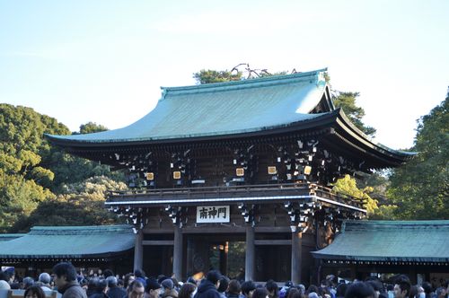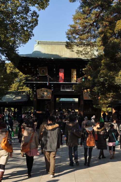Il est une cérémonie de début d'année à laquelle je vais maintenant assister : Dohyo-iri. Je me rends pour cela au sanctuaire Meiji-Jingu à Tokyo. En ce vendredi de trêve, il y a énormément de monde dans le vaste parc de ce sanctuaire : Situé en bordure d'Harajuku, ce sanctuaire meiji est aussi connu sous le nom de « demeure impériale » . Il fut érigé en l'honneur des âmes divines de l'Empereur Meiji (mort en 1912) et de sa femme, l'Impératrice Shoken (morte deux ans plus tard). Il faut cependant savoir que les deux époux reposent en réalité à Kyoto. Le sanctuaire Meiji-Jingu est donc un endroit symbolique qui fut détruit par les bombardements de 1945 mais sera reconstruit en 1958. Il sert de trait d'union entre le Japon traditionnel et l'ouverture du pays à la modernité. Il est surtout le plus grand lieu de culte shintoïste du Japon. Et est entouré d'un bois artificiel, le Parc Yoyogi, s'étendant sur une surface de 700 000 m2, qui possède environ 130 000 arbres de 365 espèces différentes et qui représentent des dons venus de tout le pays lors de la construction du sanctuaire.Le parc offre aussi un magnifique jardin impérial, le Minami-ike Shobuda, qui compte plus de 150 espèces d'iris et de nénuphars. L'allée Icho Namiki, du nom des arbres bordant l'allée (icho) et considérés comme les plus vieux du monde. Le Meiji Treasure House expose les portraits des empereurs mais aussi des objets leur ayant appartenu.