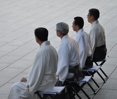 Le Dohyo-iri ( cérémonie d'entrée sur le ring) symbolise aussi un nouveau départ, la venue prochaine du printemps et d'une nouvelle période de combats sumo. Avant l'intervention des sumo, j'assiste à l'arrivée des prêtres participant à la cérémonie. Ceux-ci ont auparavant participé à une autre cérémonie, plus discrète, à l'intérieur du sanctuaire (photo ci-dessous).