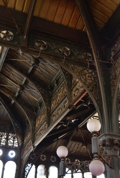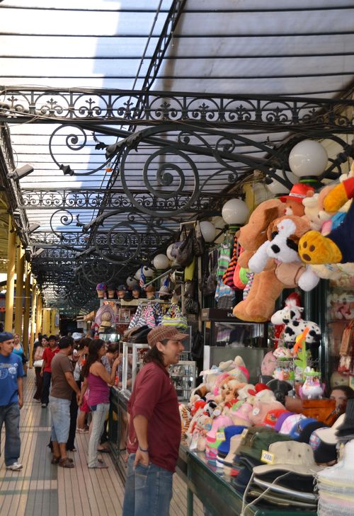 Une autre construction attire mon attention: Celle de la Gare ferroviaire centrale de Santiago du Chili (photo ci-dessous). La charpente métallique fut réalisée avec le concours des usines du Creusot, à l'époque où la famille Schneider régnait sur l'entreprise. Officiellement appelée Gare de Alameda, cette gare centrale est le principal terminal ferroviaire du pays. Le bâtiment fut conçu par Gustave Eiffel en 1897 et est situé au sud de l'avenue Alameda ( d'où son nom) et sera déclaré monument historique national en 1983. A l'intérieur, on trouve non seulement des trains en partance vers le Chili mais aussi une station modale de métro. Un Mall commercial ( Arauco Paseo en photo ci-dessous) abrite une centaine de boutiques dans une architecture traditionnelle. C'est le 14 septembre 1857 que devait être inaugurée la première liaison ferroviaire chilienne entre Santiago et San Bernardo. Seuls quelques hangars protégeaient alors les quais des intempéries. On en rajouta d'autres lors de l'ouverture de la voie ferrée en direction de Valparaiso mais la véritable gare ne prendra forme que très lentement. En 1884, l'infrastructure d'alors n'apportait plus entière satisfaction. Et le premier directeur des chemins de fer chiliens, Eulogio Altamirano fit le projet de remplacer les anciens hangars par deux nouvelles structures en acier reliées à une tour et encadrées par deux immeubles de bureaux construits dans la style néo-classique . En 1897, des travaux d'envergure aboutiront à la démolition de la première gare afin de construire à la place une seule et même structure d'acier (troisième photo) encadrée par des bureaux plus grands. C'est l'entreprise du Creusot de la famille Schneider qui sera chargée de cette nouvelle construction. Une restauration complète des lieux fut entreprise en 2003 et 2004 pour un investissement total s'élevant à 3,1 millions de dollars.