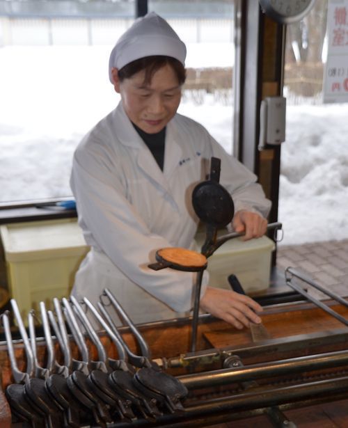 A la descente de l'autobus, je rencontre une jeune femme qui travaille dans ce centre artisanal. Kaoru O'Hara va ainsi me faire visiter deux heures durant le centre en m'expliquant de façon très complète le fonctionnement de celui-ci et en me permettant de faire des photographies dans les meilleures conditions. Qu'elle en soit ici remerciée! Kaoru (photo ci-dessus) est un personnage peu ordinaire. Professeur de musique, chanteuse ( mais oui, elle a même sorti son propre CD de chansons enfantines), cuisinière, elle est aussi professeur de cuisine et vous enseignera mille et une façons d'accommoder les légumes et les fruits au quotidien (voir infos pratiques). Il a beaucoup neigé cette nuit sur la région et le centre a l'air un peu endormi. Il y a très peu de visiteurs et j'aurai tout le loisir de poser les questions qui me viennent à l'esprit. Je commence la visite par un atelier de pâtisserie (ci-dessous). Une dame confectionne des « Nambu Sembei ». Il s'agit de petites galettes de riz avec des noisettes à l'intérieur, dont l'origine remonte au XIV ème siècle. A l'époque, l'Empereur Chokei avait épuisé toutes ses provisions. Un de ses serviteurs trouva de la farine de blé, des graines de sésame et du sel et fabriqua dans son casque ce qui reste aujourd'hui une galette légendaire. Une tradition locale réalisée à base de fleur de riz, ou de fleur de blé. Les visiteurs peuvent s'initier à la confection de ce type de friandise, moyennant 100 Yens.