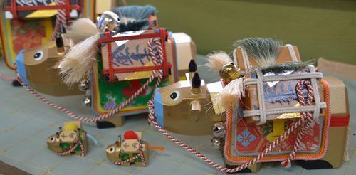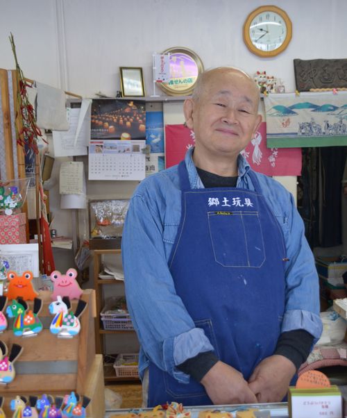 Après les réjouissances, me voici dans la boutique de Monsieur Omori, artisan de son état qui fabrique des jouets en bois comme par exemple les chagu chagu (chevaux) montés en porte-clés. Il y en a de toutes les couleurs (photo ci-dessus). Le Chagu chagu tient son origine d'un cheval richement harnaché et paré de nombreuses clochettes. Une centaine de chevaux défile ainsi dans le petit village de Takizawa, situé à une quinzaine de kilomètres de Morioka, lors de la Fête du cheval Chagu Chagu. Ces clochettes ( dont celle se trouvant en-dessous du cou des chevaux) produisent un joli son, reconnu de nos jours comme bien national au Japon. Autrefois, ces clochettes étaient supposées éloigner les loups. La Fête Chagu Chagu existe depuis 200 ans , en reconnaissance du dur labeur de ces chevaux qui œuvrent à la plantation du riz. Il faut dire que le cheval est présent de très longue date dans la région d'Iwate. Et reste l'ami de l'homme (celui-ci partage encore parfois de nos jours sa maison avec l'animal).