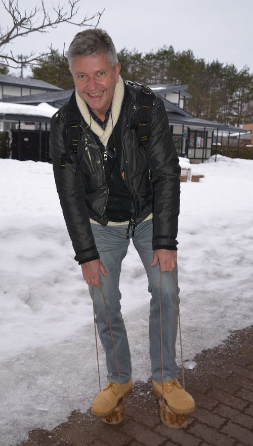 Eh oui, c'est moi, en train de m'exercer à un jeu d'enfant, les pokkuri (ci-dessus). Que dire de ces chaussures en bois ( il y en a de nombreuses dans la tradition japonaise) auxquelles on a rajouté des cordes pour en faire un jouet? Pas grand chose si ce n'est que tenir sur ces chaussures-là est avant tout une question d'habitude, et peut vous faire échapper aux flaques d'eau. Pour l'heure, je dois dire que j'y arrive sans difficulté...
