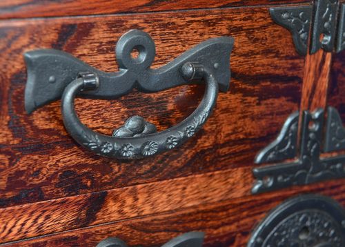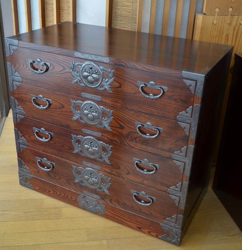 Me voici à présent face à une commode Iwayado Tanzu (textuellement meuble du sud de la région d'Iwate)dont l'origine remonte au XII ème siècle à l'époque où l'influent lord Fujiwara no Kiyohira permit le développement de la région Iwayado ( au sud d'Iwate) depuis la ville d'Oshu. L'ère Meiji connut la modernisation de la société japonaise et ce genre de commodes Iwayado Tanzu devint très populaire parmi les classes populaires. Un meuble réalisé avec soin, peint à la laque, et orné de charnières et poignées en métal gravé (ci-dessus) qui séduisit de nombreux japonais bien au-delà des frontières du Tohoku. Les ventes exploseront même à Tokyo, la capitale. A l'origine meuble du terroir, il fallut une exposition de ce genre de commodes à Tokyo dans les années soixante pour définitivement populariser le concept et reconnaître une fois pour toutes le savoir-faire des artisans. Leur art fut d'ailleurs reconnu en 1985 comme métier traditionnel national par le gouvernement nippon. Et il est aujourd'hui de bon ton de posséder dans sa chambre à coucher une Iwayado Tanzu, qui peut tout de même se négocier une petite fortune ( la commode ci-dessus coute 450000 Yens, soit 4515 euros!)