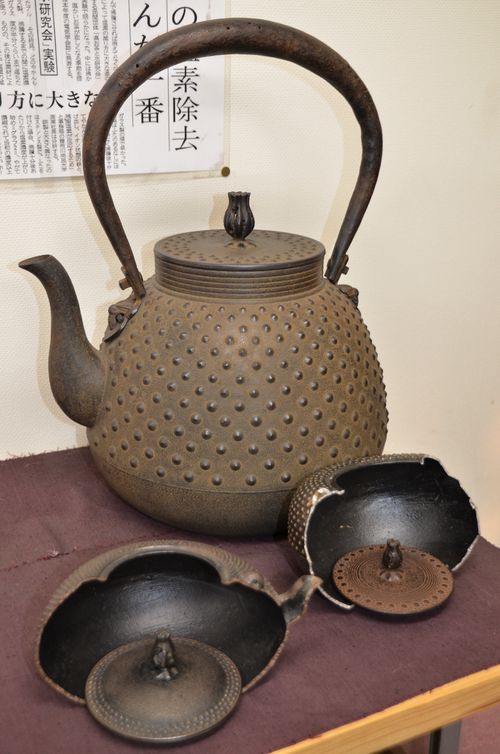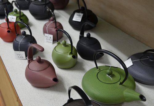 L'une des spécialités de Morioka reste le travail de la fonte. Les théières Tetsubin sont des contenants en fonte munis d'un bec verseur et d'une poignée sur leurs parties supérieures, et destinés à faire bouillir de l'eau pour l'utiliser notamment pour la préparation du thé. Les Tetsubin sont posées à même le charbon de bois, sont souvent ornées de motifs ( entre 3000 et 10 000 poinçons pour certains modèles), possèdent toutes sortes de formes et de contenance ( de 0,5 litre à cinq litres et plus comme pour les théières géantes, plus ornementales qu'utilisables dans la vie de tous les jours!). Il y a différents types de théières: Les Tetsubin (qui tiendraient leur nom de la bouilloire tedorigama utilisée de 1522 à 1591, sous l'ère Sen no Rikyu, et seraient devenues au XIX ème siècle un symbole de statut plus qu'un objet de cuisine), mais aussi les yugama (bouilloire traditionnelle) et les théières colorées surnommées Kyusu. Au début du XVII ème siècle, la puissante famille qui régnait à l'époque sur la région de Nambu fit venir un artisan de Kyoto à qui elle demanda de fabriquer des théières. Ainsi fut créée la théière Nambu. J'ai mis en ligne une vidéo ( dans le section Médiathèque---> vidéos) qui montre la fabrication d'une théière. Depuis la conception du moule jusqu'au coulage de la théière puis de sa finition. Ces théières sont fabriquées depuis 2000 ans à partir du fer contenu dans le sable japonais. La fonte traditionnelle de Morioka est surtout connue depuis le XVI ème siècle, sous le nom de Nambu Tekki, non seulement à l'échelle du Japon mais aussi mondialement. Dès l'époque Edo, on trouvait déjà dans cette région de nombreux ustensiles en fer, et la technique de tatarafuki (enrichissement en oxygène à l'aide de gros soufflets) permit de produire un acier de très grande qualité. Et le savoir-faire de Morioka en matière de théières est indiscutable. Ainsi la maison de thé française, Mariages Frères , commanda t-elle les fameuses théières bleu marine dans les années 1970 qui firent depuis la réputation de Morioka. D'autres coloris sont apparus depuis: Rouge Ferrari pour l'Italie, et gris dauphin pour l'Allemagne. Et l'on peut désormais choisir sa théière dans différentes couleurs grâce à la création d'une nouvelle ligne, plus moderne, de théières (photo ci-dessus).