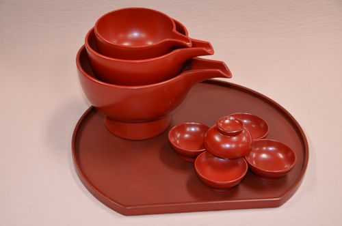 Deux autres vaisselles attirent aussi mon attention: Les laques Joboji-nuri (première photo ci-dessus) comme ce superbe service à saké ci-dessus, et les laques Hidehira-nuri (deuxième photo) constituées de différents objets (boites, bols...). Les laques Joboji tirent leur nom de la famille qui régna sur Joboji, la partie nord d'Iwate durant le Moyen âge. Les moines seraient à l'origine de la création de cette laque alors qu'ils construisaient le temple Tendaiji. La caractéristique essentielle de la vaisselle Joboji réside dans l'utilisation de matériaux de qualité. Aujourd'hui, sept entreprises (employant une trentaine de personnes) continuent de produire bols, plateaux et vases. Quant aux laques Hidehira, elles connurent leur développement sous le règne d'Ohshu Fujiwara, et que celui-ci exerça son pouvoir sur Hiraizumi, durant la période Heian (794-1185)et soutint la construction de temples et l'inventivité artistique des moines de l'époque. Au final, une production de laques apparut dans le village de Koromogawa (près de Hiraizumi).