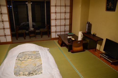 Comme à chaque préparation de voyage, je prends une carte et mon guide afin de dénicher des endroits intéressants à visiter. Beppu m'a attiré à cause de ses sources chaudes. Située sur l'île de Kyushu, dans la préfecture d'Oita, cette ville compte de nos jours quelques 130 000 habitants, est précisément célèbre pour ses sources chaude et fut fondée le 1er avril 1924. Son arbre symbole est le camphrier tandis que sa fleur est le rhododendron. En se promenant à Beppu, on peut ainsi apercevoir partout des fumées blanches qui sont en réalité de la vapeur d'eau émanant des multiples sources volcaniques qui sont présentes. Il y en a environ 3000 dans la ville, ce qui fait qu'on surnomme Beppu la ville le plus géothermique au monde. Chaque jour, ce sont environ 100 000 litres d'eau chaude qui jaillissent des profondeurs de la terre ( à une profondeur de 300 mètres!). Il est possible de se baigner dans certaines sources, pas dans d'autres. J'ai décidé de vous emmener aujourd'hui à la découverte des Jigoku (sources d'eau chaude réputées pour leurs couleurs variables) qui sont des sources trop chaudes pour pouvoir s'y tremper. A mon arrivée à Beppu, j'aperçois en sortant de la gare une source d'eau chaude qui jaillit d'une fontaine située sur la place (photo ci-dessous). Heureux présage! J'aurai quelques difficultés à trouver mon hôtel normalement facile à trouver (il faut toujours se méfier des indications données par Booking.com!) et je ne l'atteindrai qu'après une quinzaine de minutes de marche et grâce à l'aide de plusieurs personnes en ville. Kouraku hotel n'est pas si connu que cela, est planqué dans un îlot de bâtiments et, qui plus est, n'est pas très bien éclairé la nuit. Mon long voyage depuis Tokyo s'était jusqu'ici bien passé mais j'arrivais toutefois très fatigué par cette journée de train. Depuis Kokura, j'avais emprunté un train express, le Sonic (deuxième photo) qui ne mit qu'une petite heure avant de me déposer à Beppu. Ma chambre (troisième photo) est une chambre japonaise traditionnelle avec un futon en guise de lit, dressé sur le tatami. Je n'y dors pas formidablement mais l'avantage est, qu'en cas de tremblement de terre, on tombe de moins haut puisqu'on est déjà au sol. Le réceptionniste est empoté pour sortir la facture des nuitées d'hôtel, met beaucoup de temps avant de réagir, ce qui a le don de m'agacer.