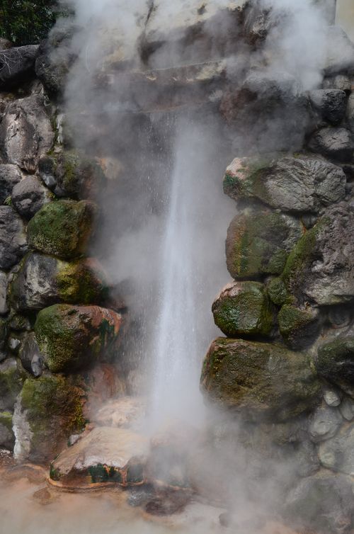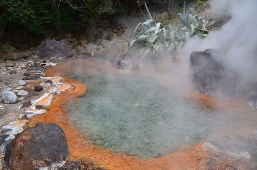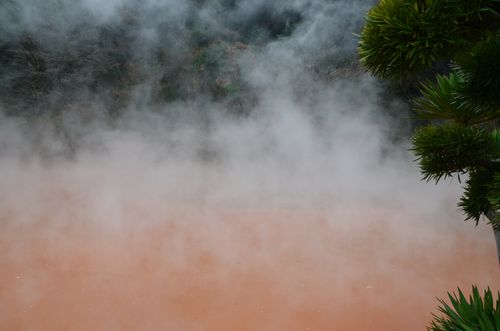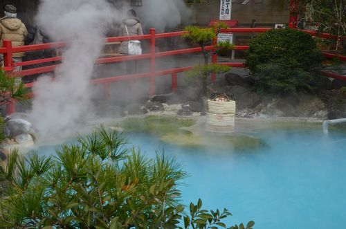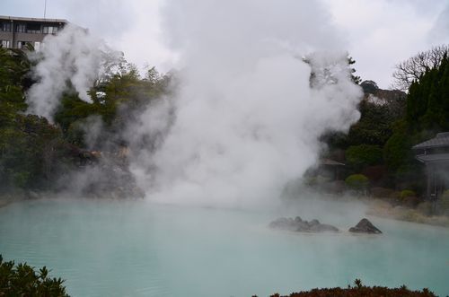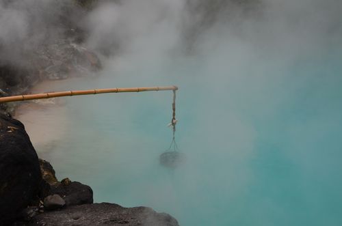 Mais au fait, quel est le principe d'une source chaude? C'est une source dont l'eau sort du sol à une température élevée, grâce à un processus géothermique. L'eau se réchauffe ainsi au contact des roches chaudes des entrailles de notre planète (plus les roches sont profondes et plus elles sont chaudes). Dans les régions volcaniques comme au Japon, les eaux peuvent même être directement chauffées par le magma (roche en fusion entre 1000 et 5000°C contenant des gaz dissous) et former à l'occasion des geysers (cela arrive lorsque la vapeur de la source d'eau chaude n'a pas pu se dissoudre régulièrement). Dans le cas d'une dissolution régulière de la vapeur de la source, on assiste à l'apparition d'une fumerolle. D'autres fois, l'eau sort de la source mélangée avec de la terre ou de l'argile bouillonnant et porte alors le nom de mare de boue. La température ambiante des sources chaudes que je découvre à Beppu atteint les 100°C. D'où la nécessité d'être très prudent aux abords de ces sources et de ne surtout pas prendre le risque de glisser car les brûlures seraient irréversibles. La Préfecture d'Oita à elle seul compte environ 762 sources chaudes, qui équivaut à un débit de 4437 litres/seconde.