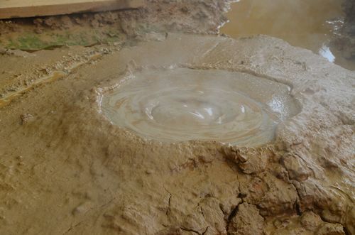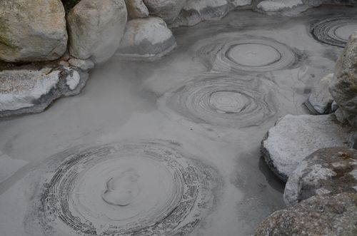 Le deuxième enfer brûlant qui s'offre à nous s'appelle Oniishibozu-Jigoku. Oniishi est le nom qui est donné à l'endroit où se trouvent ces mares de boue grise qui forment de grosses bulles en bouillonnant (photo ci-dessous). Oniishibozu signifie les crânes rasés des moines d'Oniishi ( à cause de la forme des grosses bulles formées en surface).