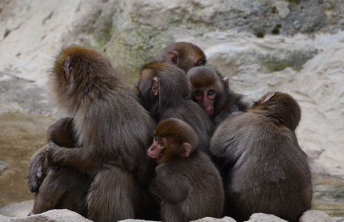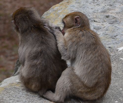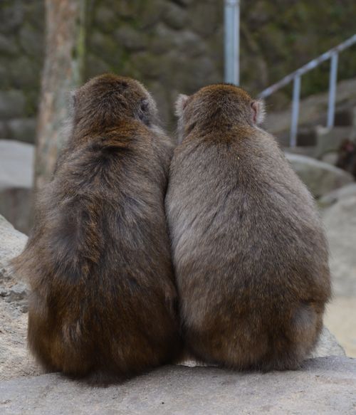 Je monte un long escalier et croise quelques singes sur mon chemin. Pas apeurés le moins du monde par ma présence, ils continuent leur chemin et je fais de même. J'en aperçois un (ci-dessous) perché sur un rocher. Un bon moyen de dominer la situation. Il est peut être le chef d'un groupe, qui sait? Un peu plus loin, des couples se forment ( de quel sexe, je l'ignore!) et s'épouillent mutuellement. Celui qui épouille le fait avec le plus grand soin tandis que le singe épouillé semble prendre un grand plaisir à ce genre d'exercice et il se couche au pied de son congénère ( oh oui chéri, que c'est bon! Fais moi du bien!)(photo ci-dessus). En haut des escaliers, une guide japonaise s'adresse au public rassemblé autour d'elle. Non loin de là, des singes forment un petit groupe, peut être pour se tenir chaud ou tout simplement à cause d'une réunion de famille (ci-dessus).