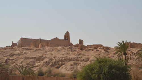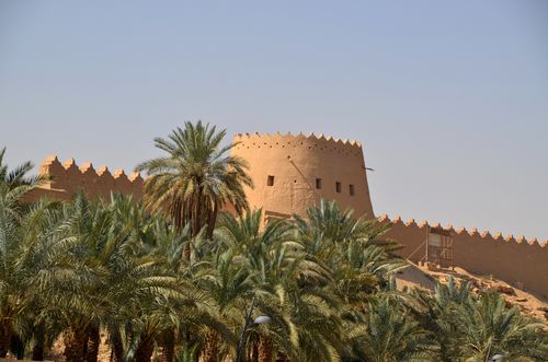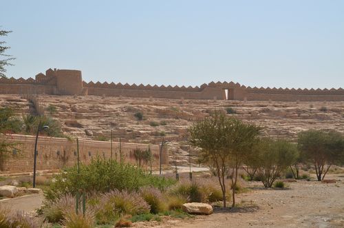 Il m'est difficile d'obtenir des informations sur les curiosités touristiques. Riyad n'est pas à proprement parler un lieu de tourisme et les gens que j'interroge sur place ne m'apportent pas beaucoup d'aide. Je choisis de visiter le vieux Riyad appelé aussi Addiriyah. Ce lieu est symbolique à plusieurs titres, historique,culturel, architectural et traditionnel. Pendant près de trois siècles, Addiriyah fut le centre de décision de la famille Al Saoud, famille régnante de l'Arabie saoudite depuis 1744. C'est de cet endroit qu'apparut l'idée ( en 1745) de guider le peuple sur la voix du prophète et de chasser du pays les hérétiques. Addiriyah reste aujourd'hui un lieu de mémoire pour beaucoup de Saoudiens qui viennent pique niquer ou se promener à l'endroit qui vit jadis l'ascension du premier état saoudien et servit de capitale. Situé à une dizaine de kilomètres du centre-ville de Riyad, Addiriyah est aujourd'hui un immense chantier: On y construit et on rénove. Notre taxi nous ballade au hasard des rues et je suis bien obligé de lui faire confiance. J'aperçois au loin les fortifications de la vieille ville, murailles qui furent témoins de bien des batailles (photo ci-dessous).