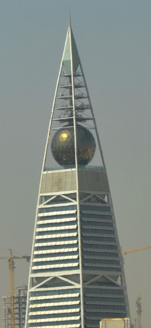 Parmi les curiosités de la ville, je remarque la Tour Faisaliah (photo ci-dessus) d'une hauteur de 267 mètres et construite par l'architecte Norman Foster de 1997 à 2000. Sa forme pyramidale lui donne un aspect original, avec un globe de verre en son sommet, globe qui abrite un restaurant panoramique. Un centre commercial réservé aux familles ( et interdit aux hommes seuls!) s'y trouve également ainsi qu'un hôtel cinq étoiles. La Tour Faisaliah est le premier gratte-ciel construit dans le royaume. Elle possède 44 étages qui coutèrent la bagatelle de 350 millions de dollars financés par la Fondation du Roi Faisal.