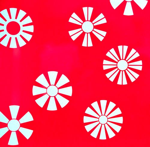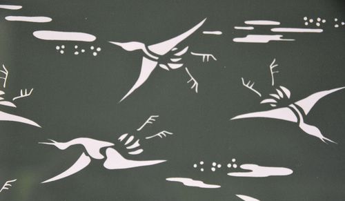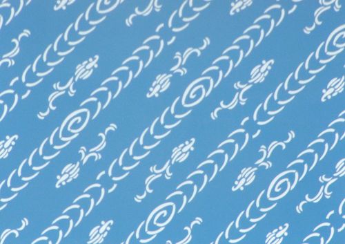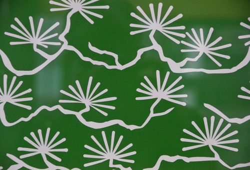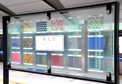 Nous arrivons maintenant à Shibaura Futo, la cinquième station du Yurikamome et la dernière station avant de franchir le pont arc-en-ciel (Rainbow bridge). »Tsuyushiba monyou » représente de l'herbe couverte de rosée matinale (ci-dessous). Ce dessin est couramment utilisé pour les fusuma, ces portes coulissantes japonaises à écran opaque rencontrées dans l'habitat traditionnel nippon. D'une taille généralement similaire à celle d'un tatami, les fusuma apparurent dans le style architectural shinden-zukuri qui donnera ensuite naissance au style shoin-zukuri. Dans les habitations de la Cour de l'époque Heian, les fusuma servaient à isoler temporairement certains espaces de la salle unique dans laquelle les nobles vivaient. On retrouve aussi le même dessin sur les Tenugui, ces petites serviettes japonaises en coton, blanches et parfois ornées du mon (insigne héraldique) de la famille, et parfois imprimées de motifs divers traditionnels. D'usage courant, cette serviette est aussi utilisée pour se couvrir la tête au kendo.