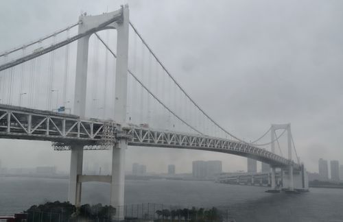 Sur l'île d'Odaiba, nous nous arrêtons à la sixième station de la ligne : Odaiba Kaihin Koen. Depuis cette station, vous pouvez vous rendre au Parc Sony Explora Science (voir infos pratiques). Mais aussi au Tokyo Joypolis, la plus grande salle d'arcades du Japon, ouverte en 1994 par la marque SEGA. Temple du jeu vidéo, vous y trouverez toutes sortes de distractions amusantes. A proximité existe aussi le Sewerage Exhibit Hall »Rainbow » (traitement des eaux usées de Tokyo). Depuis cette station, vous vous rendrez aussi au pont Rainbow Bridge pour une petite promenade (infos pratiques). Le pont Arc en ciel est un pont suspendu (ci-dessous) au-dessus de la baie de Tokyo et relie les quais de Shibaura à l'île artificielle d'Odaiba à Minato. Il fut construit en 1993. Tout proche, se trouve le parc de Daiba qui est en réalité l'une des six forteresses destinées autrefois à protéger Tokyo. Appelée aussi Dai-San Daiba ( ou batterie N°3) cette île fut rénovée en 1928 et rouverte au public sous le nom de parc métropolitain de Daiba. Vous finirez votre visite au parc marin d'Odaiba (infos pratiques).