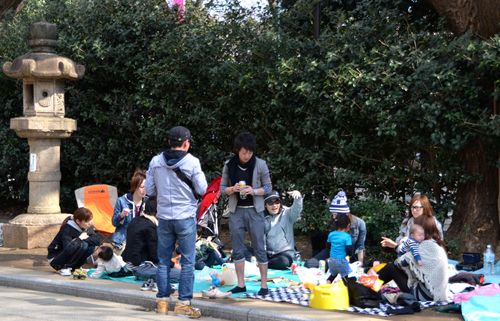 Petits et grands, jeunes et moins jeunes se promenaient le long de cette allée bordant les douves qui entourent le jardin de Kitano maru (jardin situé tout près du Palais Impérial). Il faut dire qu'un festival se tient dans le quartier de Chiyoda depuis le 30 mars dernier. Beaucoup de visiteurs profitent des nombreux stands placés dans l'entrée principale du sanctuaire Yasukuni pour manger ou boire quelque chose, ou pour éventuellement faire leur hanami (profiter des cerisiers en fleurs en famille ou entre amis, allongés sur de grande bâches)