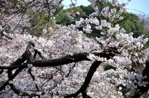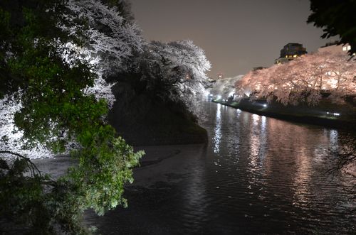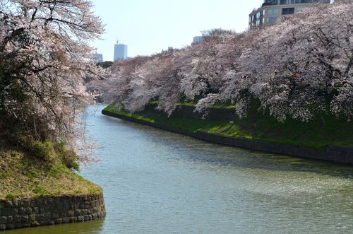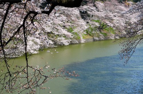 Belle journée que celle d'aujourd'hui à Tokyo. Une journée de printemps avec du soleil, juste assez pour pousser les gens à sortir se promener pour admirer les cerisiers en fleurs. A une dizaine de minutes de la station de métro Ichigaya, j'emprunte l'avenue Yasukuni (Yasukuni dori) et je trouve sur ma droite Chidorigafuji (juste avant de franchir une passerelle pour piétons et une lanterne ( une sorte de petit phare appelé lanterne haute, qui appartient au sanctuaire Yasukuni tout proche). L'endroit était facile à trouver aujourd'hui car une foule était venue admirer les cerisiers en fleurs le long des douves(photo ci-dessous).
