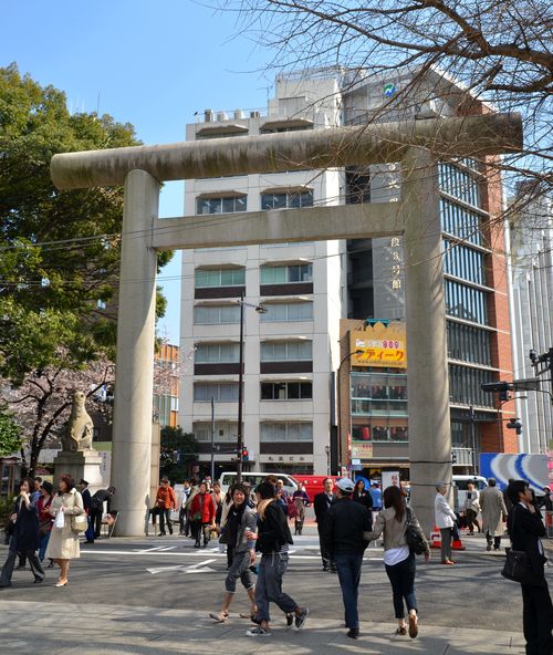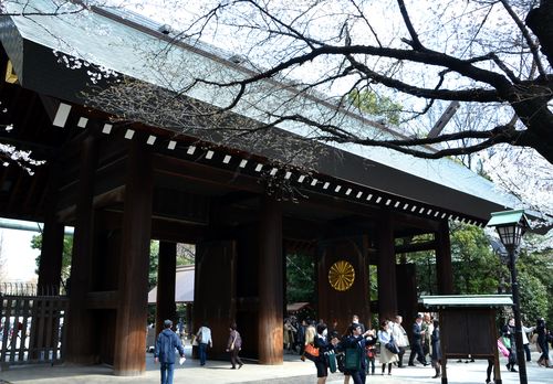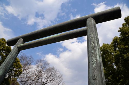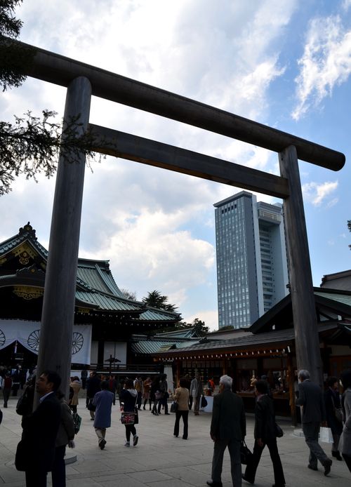 J'en avais entendu parler mais je ne m'y étais pas encore rendu. Yumi, mon professeur de japonais m'en a parlé hier car il y aura bientôt une fête sur place (voir infos pratiques). On y célèbrera le printemps comme dans beaucoup d'endroits au Japon. J'ai donc décidé de partir aujourd'hui à la découverte du...sanctuaire Yasukuni, situé à une dizaine de minutes de marche du métro Ichigaya. « Le sanctuaire du pays apaisé » est un sanctuaire shinto qui fut construit en 1869, sur la volonté de l'Empereur Meiji, pour rendre hommage aux Japonais qui donnèrent leur vie au nom de l'Empereur du Japon. Les petits Républicains que nous sommes sont bien incapables de comprendre cette dévotion envers un personnage au-dessus de tous, représentant de Dieu sur terre ( comme l'était notre roi de France jadis). Et pourtant, c'est pour ne pas oublier le sacrifice de ces deux millions d'âmes consentis entre 1868 et 1951, que ces soldats ont été déifiés dans ce sanctuaire. Considéré comme l'un des symboles du passé colonialiste du pays et des nationalistes, il est célèbrement connu pour les polémiques qu'il suscite, tant en Extrême-Orient qu'en Occident. En ce qui me concerne, j'ai rencontré une foule impressionnante de visiteurs, sans agressivité et très calmes.