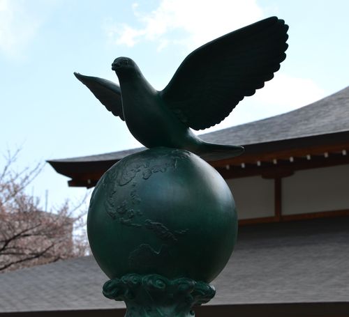Le sanctuaire accueille aussi des statues qui sont là pour honorer les animaux qui ont participé à leur façon aux conflits armés en rendant service à la nation japonaise: Chiens, chevaux et pigeons voyageurs (ci-dessus). Une statue de coursier, faite de bronze, honore la mémoire des chevaux dans ce sanctuaire depuis 1958. En 1982, on rajouta la statue d'un pigeon et d'un globe, puis en 1992, une autre statue, toujours en bronze, d'un berger allemand.