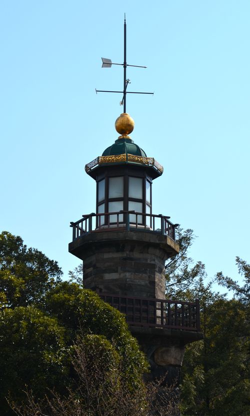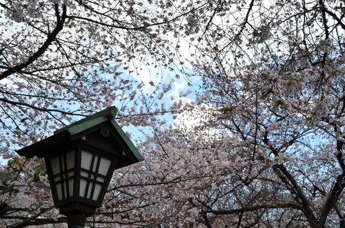 Pêle-mêle , je cherche le monument Shagou Hyou, qui est une stèle sur laquelle on a gravé le nom du sanctuaire mais ai du mal à la trouver car elle est dissimulée derrière des stands installés pour le prochain festival du printemps. Même chose pour un autre monument, celui de Hitachimaru , et pour une magnifique sculpture nommée Irei no Izumi ( printemps qui régénère l'âme) qui n'est pas actuellement du tout mise en valeur. Cela nous conduit à la dernière étape de notre visite , les cerisiers en fleurs (ci-dessous). Ces cerisiers sont dominés par la lanterne haute (ci-dessous). Les arbres furent plantés pour la première fois dans ce sanctuaire en 1870, un an après sa construction. Ils symbolisent la fierté de ces combattants morts au combat. On compte aujourd'hui 600 arbres dont des yamazakura et des somei yoshino. C'est à ces cerisiers que l'institut météorologique japonais se fie chaque année pour publier un calendrier de floraison des arbres partout dans le pays.