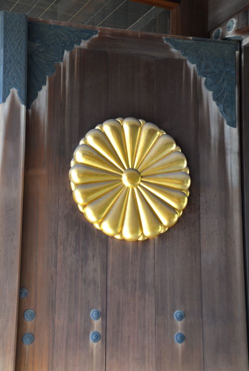Ci-dessus la porte sud du sanctuaire. IL existe aussi une porte principale (Shinmon, sur la deuxième photo). La porte principale fut achevée en 1934 et a été fabriquée en bois de cyprès. Chacune des portes arborent un chrysanthème d'un mètre et demi de diamètre (troisième photo). La restauration de la porte ( qui consista également au remplacement des tuiles du toit) s'acheva en 1994. Une seconde porte du sanctuaire (Daini Torii, sur la quatrième photo) fut construite en 1887. C'est la plus grande porte en bronze du Japon. Une troisième porte, Chumon Torii (cinquième photo), fut refaite en 2006 à l'aide de bois de cyprès venant de la Préfecture de Saitama. Ishi Torii (sixième photo) est une grande porte en pierre qui conduit à un parking. Enfin, une septième porte, Daiichi Torii (Grande porte ou première porte du sanctuaire)(dernière photo) figure comme la plus grande porte du pays. Elle fut construite en 1921, et décrite dans un poème comme « la grande porte qui semble fendre le ciel ». Sérieusement endommagée par les intempéries, elle fut démontée en 1943 et la porte actuelle fut installée en 1974 et mesure 25 mètres de haut.