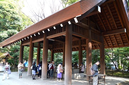 Otemizusha (ci-dessus) est la principale fontaine de purification du sanctuaire. Ce bassin de purification fut offert par des citoyens japonais résidents aux Etats-Unis en 1940 . Il est fait en granit et pèse plus de 18 tonnes. Il est de coutume de se rincer la bouche et de se laver les mains à cet endroit avant de rendre ses hommages au temple.