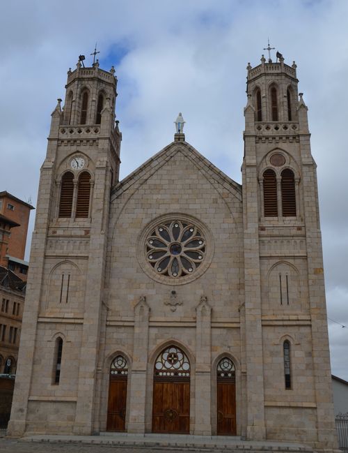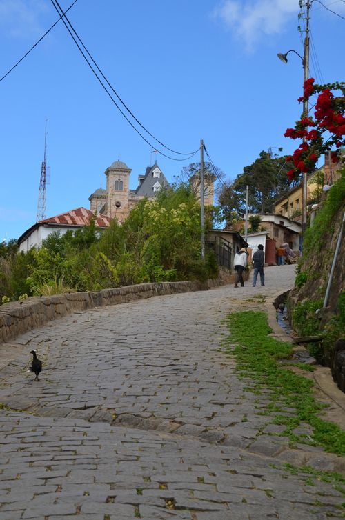 Dans le quartier d'Andohalo, se trouve une place centrale (du même nom) qui servait autrefois aux grands rassemblements publics comme les cérémonies de couronnement des souverains ainsi que les « kabary » royaux (discours) lors des grandes occasions C'est aujourd'hui un jardin public . Juste à côté se trouve le Lycée Galliéni (appelé aussi lycée d'Andohalo) (première photo ci-dessus) qui est, avec le lycée Jules Ferry, le plus ancien lycée de la capitale malgache. Il fut construit en 1908 et accueillit des garçons ( alors que le lycée Jules Ferry accueillait les filles!). Sa construction défraya la chronique car elle allait défigurer, selon certains, le paysage. Il faut dire qu'à son emplacement s'élevaient autrefois des demeures cossues des familles de la cour et de la bourgeoisie.D'illustres noms se forgèrent dans ce lycée. Dans le gymnase, le comité d'examen du baccalauréat organise les épreuves sportives à venir. Je salue l'assemblée quelques instants.Celle-ci me convie à expliquer la raison de ma présence. Je leur explique que je visite la Ville Haute pour faire un reportage qui sera publié sur mon site de voyages et je leur remet des cartes de visite. Non loin de là, la cathédrale (deuxième photo), de style néo gothique et roman, récemment rénovée, est surmontée d'une statue de la Vierge. Ses portes sont malheureusement closes en ce mardi matin et je n'aurai pas la chance de pouvoir en découvrir ses (éventuelles)curiosités intérieures. L'édifice comporte deux hautes tours et fut bâti en pierre à partir de 1873 pour rehausser l'image des catholiques.Sur la place de cette cathédrale se trouve une petite chapelle où viennent prier les fidèles ainsi qu'une tombe récente de pierre en forme de fuseau renfermant les restes de Victoire Rasoamanarivo, femme de devoir et de piété plus tard élevée au rang de Bienheureuse par le Vatican. Une peinture représente Victoire sur un mur d'enceinte de la cathédrale dans la rue voisine.