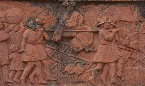 Aurélien me confie à un guide, Benji. C'est en compagnie de Benji que je vais passer ma matinée à sillonner la Ville Haute. Nous débutons cette visite devant une fresque située dans la rue Ravelojaona (qui conduit au Palais de la Reine). Cette fresque (première photo ci-dessus) relate la vie quotidienne du peuple malgache. Elle fut réalisée de 1940 à 1946 par un étudiant malgache et représente notamment l'arrivée des Français à Madagascar et la dernière reine malgache (comme sur cette photo) avant sa déportation (par les Français) sur l'île de la Réunion puis en Algérie. Nous grimpons tranquillement vers le Palais de la Reine, la curiosité du moment. Juste avant se trouve un bureau municipal (une sorte de mairie d'arrondissement) qui arbore deux drapeaux (deuxième photo) : Le drapeau communal (jaune et bleu) portant le zébu qui est l’emblème de Tananarive et le drapeau de Madagascar (rouge comme le linceul des rois autrefois, représentant aussi le sang du zébu immolé pour le retournement des morts, blanc comme le riz récolté ou le lamba, cette pièce de tissu dont se drapaient les femmes, et enfin le vert, compagnon des voyageurs avec le ravenala, arbre des voyageurs, ce vert symbolisant l'union de l'homme et de la nature, ou encore le vert des rizières).