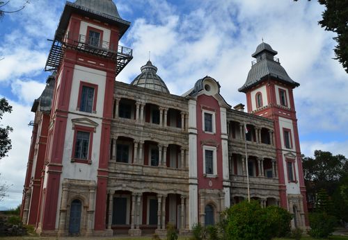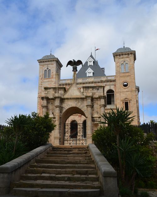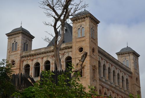 Nous voici maintenant au Palais du Premier ministre (ci-dessous). Celui-ci fut érigé dans un quartier habité par les « Andafiavaratra », puissante famille de roturiers qui donna trois Premiers ministres à la royauté, dont le premier, Rainiharo (de 1835 à 1852). Le fils de ce dernier (qui fut aussi le dernier Premier ministre avant que la France n'occupe Madagascar) édifia en 1872 ce Palais pour les besoins de ses services. Cette massive construction, qui fut bâtie par l'architecte William Pool, est un peu considérée comme une imitation du Palais de la Reine. Le bâtiment fut ravagé par un incendie en 1976, puis reconstruit à l'identique. Il abrite désormais un musée qui présente des pièces historiques qui purent être sauvées lors de l'incendie de ce palais ainsi que de l'incendie du Palais de la Reine.