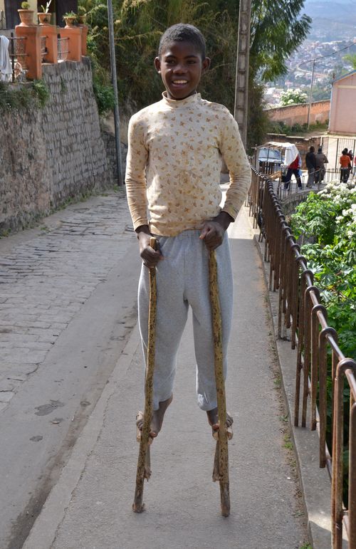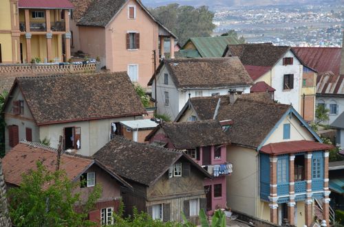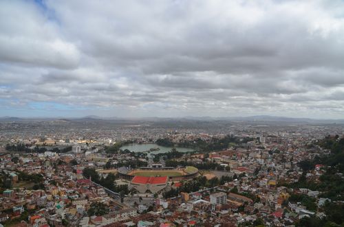 On prétend qu'il existe pas mal d'insécurité à Tananarive. Je ne me suis senti personnellement, et à aucun moment en insécurité avec Benji. Celui-ci m'a pourtant emmené dans des quartiers populaires autour du Palais de la Reine, et nous avons croisé à plusieurs reprises des groupes de gens qui ont toujours fait preuve de courtoisie à notre égard. La Ville Haute ne possède que très peu de routes et la circulation se fait principalement grâce aux ruelles (première photo ci-dessus). Ces ruelles sont souvent encadrées de murs de pierres sèches ou par des murs de terre et de bouse de zébu. Celle-ci sert non seulement d'engrais mais se révèle très efficace comme liant avec la terre dans la construction et elle se solidifie au fil du temps. Un autre liant fut autrefois utilisé par les malgaches pour la construction du Palais de la Reine : Le blanc d'oeuf. Oui, vous avez bien lu ! Pierres, chaux et œufs entrèrent dans la composition des murs. Benji me confie que 12 millions d'oeufs furent nécessaires pour réaliser le Palais de la Reine. Pour ce faire, chaque malgache devait fournir quotidiennement un œuf, contribuant ainsi à l'érection de l'édifice. J'admire sur mon passage les nombreuses maisons malgaches aux toits de tuiles argileuses (deuxième photo) accrochées aux flancs de la colline de la Ville haute. Un ponit de vue magnifique s'offre à nous (troisième photo) qui fait face à la Ville basse, en contrebas, avec en premier plan le stade de Mahamasina où le Général de Gaulle prononça cette phrase restée célèbre : »Demain, vous serez de nouveau un état, comme vous l'étiez lorsque ce palais était habité... ». Nous sommes le 22 août 1958 devant une foule nombreuse et recueillie. Madagascar est sur le chemin de l'indépendance. Le Président Philbert Tsiranana la proclamera le 26 juin 1960. Le stade de Mahamasina fut érigé sur une vaste esplanade qui servit il y a longtemps de champ de manœuvres aux troupes royales. Au pied des gradins du stade se trouve une pierre sacrée, le Vatomasina, rocher sur lequel le roi Radama II fut intronisé en 1861. Au loin, on aperçoit le lac Anosy qui accueille un monument surmonté d'une statue de la victoire en bronze, commémorant les soldats malgaches envoyés en Europe durant les première et deuxième guerres mondiales. Il reçoit aussi les eaux de pluie des collines avoisinantes et le trop-plein de la rivière Ikopa. En 1854, le Français Jean Laborde implanta sur l'îlot les pavillons de plaisance pour la Reine Ranavalona 1ère. La ville envisage dans un avenir proche et avec le concours de la Région Ile de France, de rénover totalement ce lieu en dressant par exemple deux ponts au-dessus du lac après un grand nettoyage du plan d'eau. L'implantation de restaurants et de petits marchés artisanaux sont également à l'ordre du jour afin de faire du plan d'eau un lieu touristique d'importance.