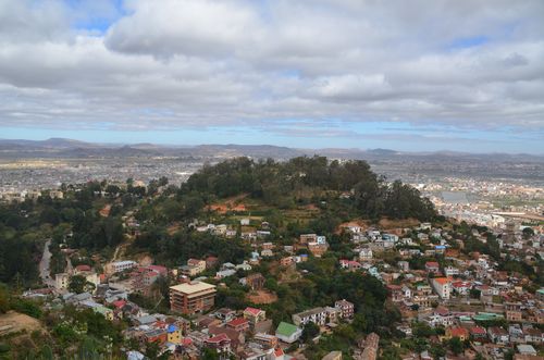 A l'endroit de ce belvédère où je me trouve en compagnie de Benji, nous sommes à 1460 mètres, au pied du Palais de la Reine. C'est à cet endroit que la « méchante reine » (comme l'appellent les malgaches), la première du genre, poussa dans le précipice, les quatorze martyrs chrétiens. Face à nous, mais un peu plus à gauche, se trouve la colline Ambohijanahary(première photo ci-dessous) qui abrite une base militaire malgache. En son sommet se trouve un arsenal.