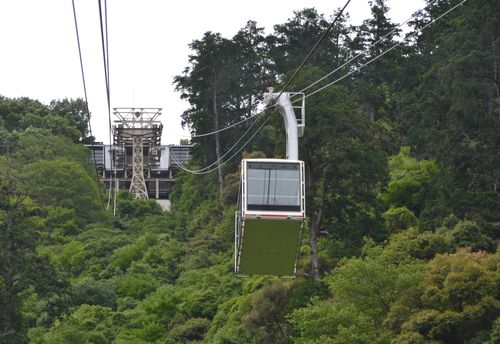 Il était une fois un château perché en haut d'un mont. C'est sans aucun doute le plus haut château jamais observé au Japon lors de mes voyages. Le château de Gifu est ainsi. Il domine, loin, très loin. Il s'agit d'en gravir les marches jusqu'au troisième étage pour s'en rendre compte (ci-dessous). De cet endroit, on domine toute la région et une vue panoramique s'offre aux visiteurs sur les quatre points cardinaux, permettant d'apprécier l'endroit stratégique de l'édifice. Le Mont Kinka , aussi connu sous le nom de Kinkazan, et situé au coeur de Gifu, culmine à 329 mètres. Il s'appela autrefois  Mont Inaba et servit longtemps de symbole pour la ville. Le Mont Dodo, situé plus au nord est toutefois plus élevé mais le mont Kinka, qui voisine avec la rivière Nagara, est assurément le poumon vert de la région. Il servit durant des siècles de terrain de chasse pour le clan Owari et l'on préserva sa forêt, devenue depuis forêt nationale avec 700 espèces d'arbres et 80 espèces d'oiseaux. En 2005, on rénova son sommet en l'équipant d'éclairages supplémentaires autorisant une magnifique vue de nuit du château. Quatre sentiers balisés permettent aux randonneurs de partir à la conquête du Mont Kinka. Oh, ce n'est pas le Mont Fuji mais ça ressemble tout de même à une promenade de santé. Les marches conduisant du téléphérique au château me l'ont prouvé. Le sentier Hyaku-MagariTosando , qui débute au musée des insectes, s'étire sur 1,1 km et 50 minutes sont nécessaires pour le parcourir. Le sentier Nana-Magari, lui mesure 1,9 km et son parcours requiert une heure environ. Le Meizo no Shokei (Chemin de la méditation) s'étire sur 2,3 km et requiert une heure de randonnée. Enfin, le sentier Umanose Tosando nécessite quarante minutes de marche pour parcourir 1,1 km. Pour ma part, n'étant pas équipé pour la randonnée, je choisis d'emprunter le téléphérique du Mont Kinka (deuxième photo ci-dessous). En quatre minutes, j'atteins le sommet du mont, sans effort et en toute sécurité. Il m'en coûtera certes 1050 yens pour un aller et retour mais que de temps (et d'énergie!) de gagner. Un départ a lieu toutes les quinze minutes, de 8h00 à 18h00.
