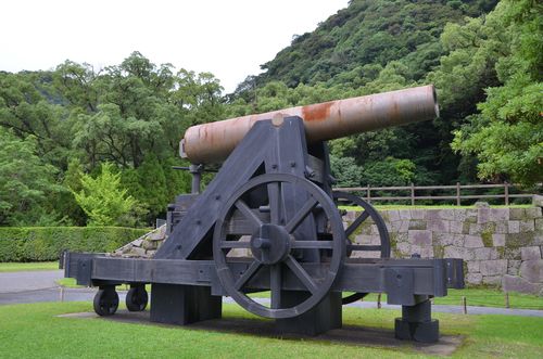 Le temps est incertain mais je débute rapidement ma promenade par un gros canon (ci-dessous) qui fut produit par un four à réverbère dont les restes se trouvent toujours dans Sengan-en. Cette arme, construite en 1857 fut d'une redoutable efficacité lors de la bataille contre l'armée anglais en 1863. C'est Nariakira qui en avait dessiné les plans. Quant au four à réverbère, envisagé dès 1851, il fut mis au point à partir de plans allemands et servit à couler de nombreux canons. C'est que Nariakira se révéla un génial inventeur, mettant au point, outre ce four, des usines d'armement, de nouveaux instruments agricoles, créant une verrerie, de la céramique, développant les domaines de la chimie, du tissage et de la filature, exploitant des mines, travaillant le cuir, mettant au point des moyens d'imprimerie.
