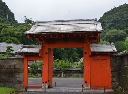 La porte principale actuelle (ci-dessous) du jardin comporte le nom des Shimazu gravé dans sa partie haute. Mais elle ne fut pas toujours porte principale. Jusqu'à la fin du XIX ème siècle, celle-ci était une porte plus modeste, appelée porte d'étain (deuxième photo) à cause de son toit réalisé avec ce métal. La couleur rouge n'était alors autorisée que pour les riches familles, ce qui était le cas des Shimazu. Cette porte se trouve à proximité immédiate de la plus grande lanterne de pierre du jardin, une lanterne d'une surface de treize mètres carrés coiffée par un lion imaginaire surnommé shishi.