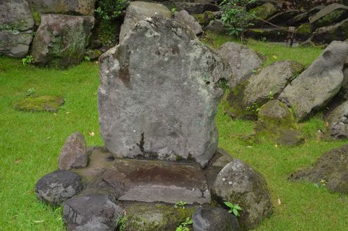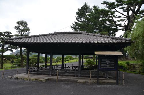 Un peu plus loin, j'aperçois la maison aux trésors (ci-dessous), un entrepôt qui servait autrefois à la famille pour entreposer ses richesses. De nos jours, nombreuses sont celles qui ont rejoint depuis le musée tout proche. Ce bâtiment fut érigé à la fin du XIX ème siècle. Voisin de cette maison, le monument du lotus Senyoren (deuxième photo) se dresse fièrement. L'inscription figurant sur la pierre mentionne l'histoire de ce lotus Senyoren qui fut ramené de Corée, au XVII ème siècle par Yoshihiro Shimazu et qui fut planté dans ce jardin. Le lotus a depuis disparu et il ne reste plus que la pierre.
