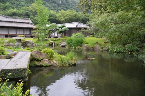 Un bassin se trouve près de la résidence Iso (photo). De là, les Shimazu pouvaient admirer l'ile de Sakurajima, en venant se reposer au pavillon Bogakuro (deuxième photo) appelé aussi azumaya en japonais et qui surplombe le jardin. Ce pavillon fut un cadeau du roi Ryukyu au début du XVII ème siècle.