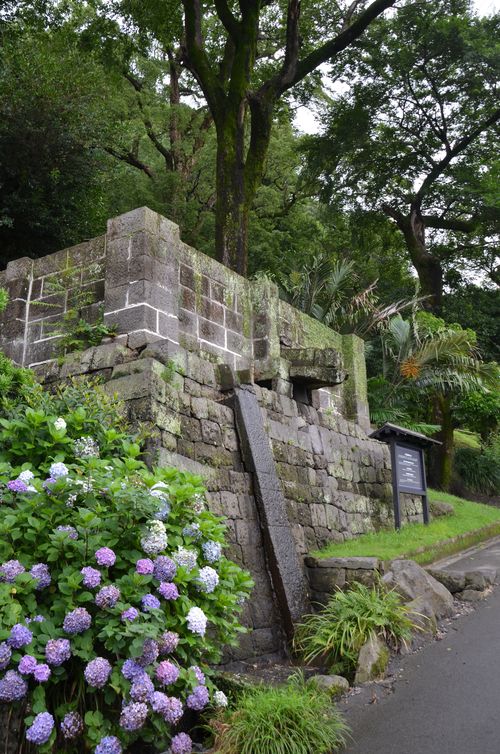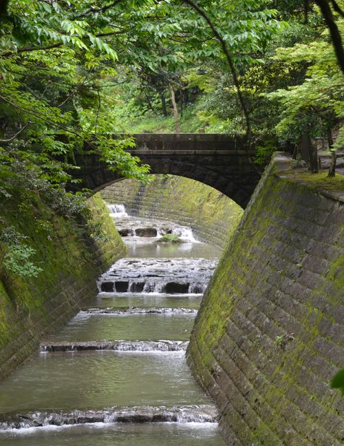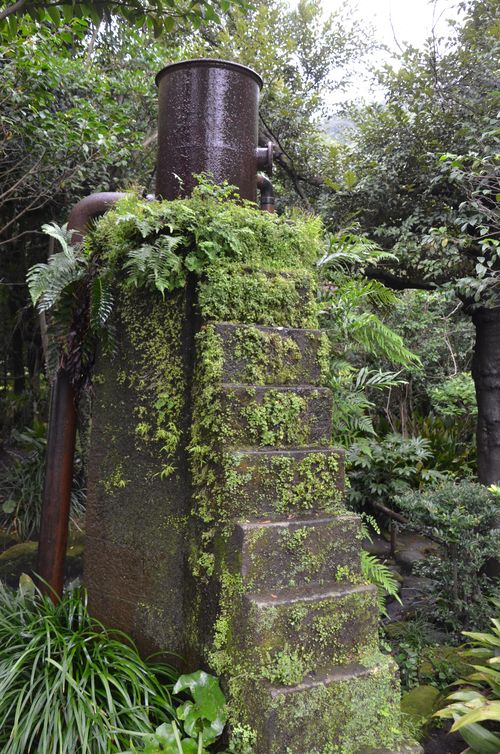 L'inventivité des Shimazu était sans limites. Ainsi cette machine Takamasu qui servait à distribuer l'eau dans le jardin (première photo ci-dessous), puis ce bassin de filtration des eaux du sous-sol (deuxième photo), construit en 1907, mais qui n'a plus aucun usage de nos jours. Je m'arrête enfin quelques instants devant les ruines de ce barrage hydroélectrique qui fut mis au point pour les besoins de la famille Shimazu (troisième photo). Construit en 1892, il fut l'un des premiers barrages du genre au Japon. Il reste d'ailleurs dans le jardin la partie supérieure d'une ancienne maison ayant accueilli jadis la station électrique Suiten buchi. Celle-ci avait été érigée à la fin du XIX ème siècle pour alimenter la mine, toute proche en énergie électrique.