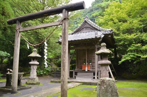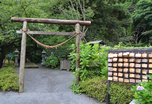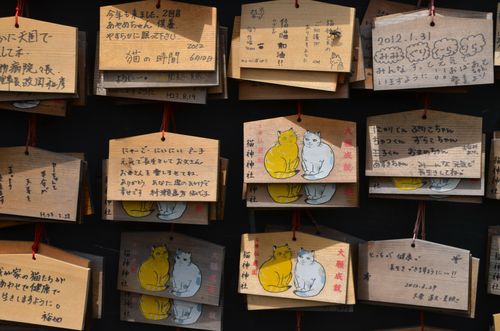 Je passe bientôt devant le sanctuaire Oniwa (première photo), puis m'arrête un instant au sanctuaire du chat (deuxième photo). Ce sanctuaire est l'un des rares de ce type visibles au Japon. A la fin du XVI ème siècle, Yoshihiro Shimazu partit pour son expédition vers la Corée et emmena avec lui sept chats. Deux seulement survécurent au voyage. Ils furent enterrés ici et un sanctuaire fut bâti pour leur rendre hommage. Des tablettes Ema permettent aux gens qui possèdent des chats d'inscrire des messages dédicacés (troisième photo). Un autre sanctuaire, plus grand celui-là, fut construit en 1869, en l'honneur de la famille Shimazu et de ses descendants. Il s'agit du sanctuaire Tsurugame.