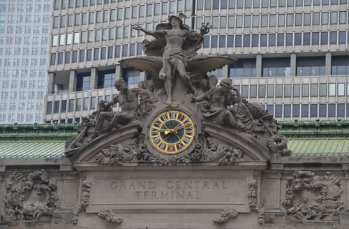 Une autre horloge, extérieure celle-ci (ci-dessous) située au-dessus de la façade extérieure de la fameuse gare, face à la 42 ème rue, est la plus grande verrerie Tiffany entourée par des sculptures taillées représentant Minerve, Hercule et Mercure, et conçues par le sculpteur français Jules-Félix Coutan (élève de Jules Cavelier à l'Ecole des Beaux-Arts , titulaire du Prix de Rome en 1872 pour son œuvre Ajax bravant les dieux et foudroyé, et pensionnaire à la Villa Médicis de 1873 à 1876). A l'époque de l'inauguration de ces statues, en 1914, l'ensemble était considéré comme le plus grand groupe de sculptures au monde avec une hauteur de presque quinze mètres (l'horloge possédant quant à elle une circonférence de quatre mètres).