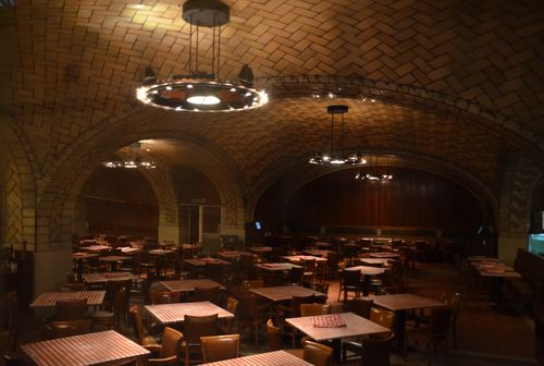 Quant à l'Oyster Bar, c'est un restaurant situé au niveau inférieur (lower level ou dining level) de la gare. Il fut d'ailleurs inauguré en même temps que celle-ci, en 1913. Son activité commerciale ne connut aucune interruption si ce n'est pour rénover l'établissement (notamment lors d'un incendie en 1997). Spécialisé dans les produits de la mer, l'Oyster Bar occupe le devant de la scène gastronomique new-yorkaise. Son architecture fait appel à des plafonds voûtés (sur la photo) construits à l'aide de briques style Guastavino. La voûte faisant face à la salle du restaurant est aussi connue pour sa bizarrerie acoustique (une personne peut parfaitement entendre ce que dit une autre qui se trouve à l'autre bout de la galerie, même à mots couverts). Mieux vaut tourner sa langue sept fois avant de parler ! Cet établissement appartient depuis 1999 aux employés .En effet, Jérôme Brody le leur avait vendu à cette date avant de décéder quelques années plus tard, en 2001. Deux succursales ont depuis ouvert leurs portes à Tokyo ( au 4 ème étage de la gare de Shinagawa et sur My Plaza, à Marunouchi, près de la gare de Tokyo). Si vous passez par là...