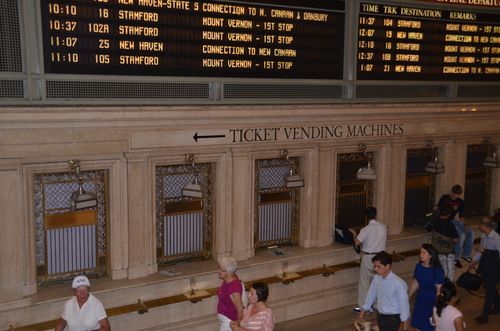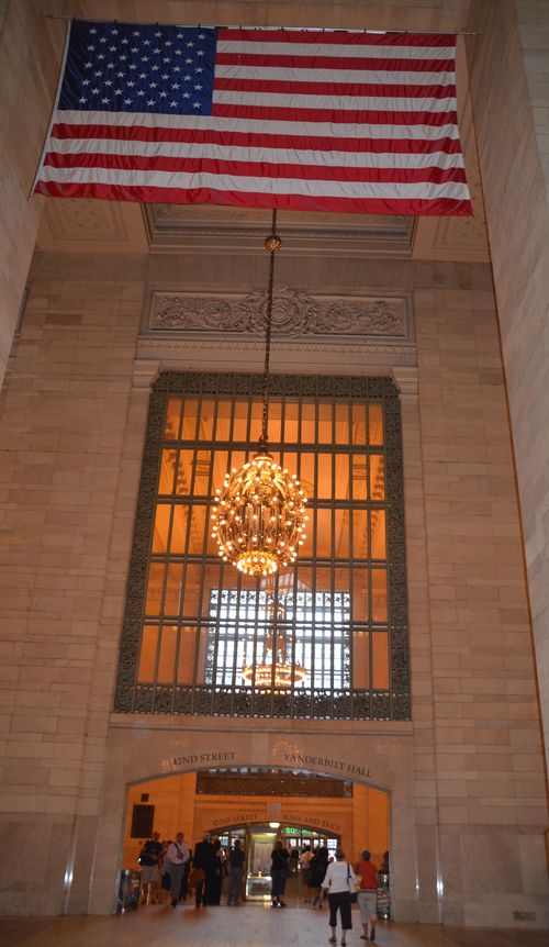 Abordons maintenant le Hall principal (Main concourse)( en photo ci-dessous). C'est le cœur de la gare. Long de 85 mètres, il possède une largeur de 37 mètres et une hauteur de 38 mètres. Lieu de passage par excellence, il est souvent envahi par une foule de visiteurs. Sur un côté, je découvre les guichets qui servaient autrefois à la vente des billets (deuxième photo). Un grand drapeau américain y fut aussi tendu quelque jours après l'attentat du 11 septembre mais un autre drapeau demeure encore au-dessus du passage qui conduit du Main Concourse au Hall Vanderbilt (troisième photo). Au centre du hall se trouve un kiosque d'information au-dessus duquel on peut admirer une superbe horloge à quatre faces (quatrième photo),icône incontournable de la gare. Chacune de ces quatre faces est fabriquée en opale, ce qui donne à l'horloge une valeur estimée entre 10 et 20 millions de dollars.