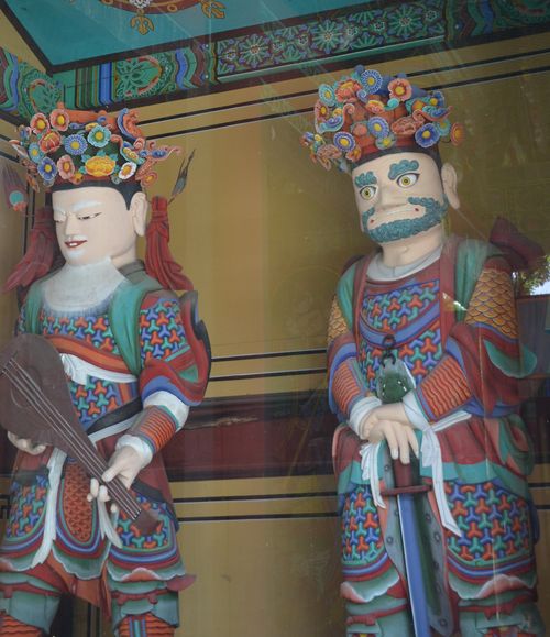 Je pénètre dans le temple par la porte Jinyeo-mun à l'intérieur de laquelle se trouvent les statues en bois des quatre rois du ciel: Vaisravana, Dhrtarastra, Virupaksa et Virudhaka, apparaissant en guerriers (en photo ci-dessus). Ces dieux vivaient au Mont Sumisan et sont issus d'une vieille tradition indienne. Ils protègent les enseignements de Bouddha et les lieux de ces enseignements. Chaque dieu a sous sa surveillance un point cardinal, exprimant de jolis sourires et des expressions bienveillantes. Le fait que ces statues soient en bois les rendent d'autant plus inestimables. En franchissant cette porte Jinyeo ( qui signifie les choses telles qu'elles sont), je trouve immédiatement sur ma droite un bureau d'information. C'est là que je fais la connaissance de Lee, un guide volontaire qui me fera découvrir le temple Bongeunsa, une heure durant. D'après la légende, le franchissement de la porte Jinyeo doit me donner l'accès à la vérité qui se cache derrière le sens des mots. Tout un programme!