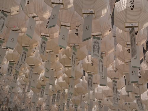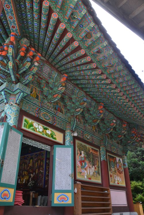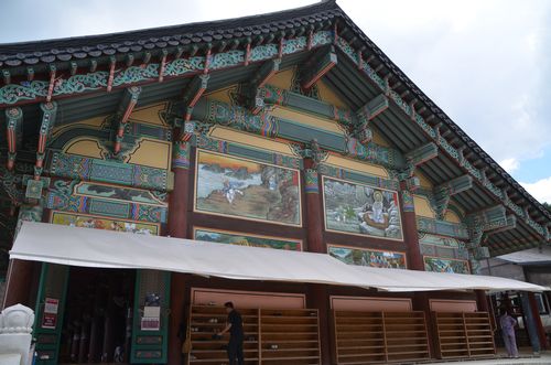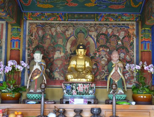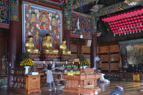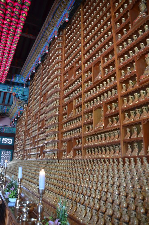 Lee et moi nous dirigeons vers Beopwang-ru, le Pavillon du roi Dharma (ci-dessous). Ce bâtiment accueille le Bouddha , roi de Dharma (enseignements) et fait face au Hall du Grand Bouddha. On l'utilise notamment pour les célébrations matinales, les grandes réunions du roi Dharma, pour les prières et la pratique du culte. A l'intérieur, on peut observer 3300 statuettes de Gwanseum Bosal, le dieu de la compassion (deuxième photo ci-dessous) qui glorifient l'esprit du bouddhisme et fait de ce temple un exemple de pratique de la vie de Bodhisattva.