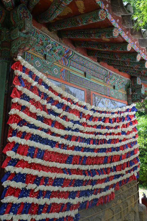 La chaleur est accablante en ce dimanche après midi et le ciel n'annonce rien de bon. Lee et moi poursuivons notre balade avec sur notre chemin la découverte de ces lanternes en papier suspendues et accompagnées de messages. Elles sont destinées à sauver les âmes des défunts du désarroi (ci-dessous). Un peu plus loin, j'aperçois un bol à nourriture (deuxième photo) utilisé par les moines du temple. Le Hall du Grand Bouddha (Daewoong-jeon) nous tend déjà les bras (troisième photo ci-dessous): Le bouddha Sakyamuni se trouve à l'intérieur, au milieu de la pièce. Il est entouré de part et d'autre par le bouddha Amitabha et le bouddha de la médecine. Ce bâtiment est le cœur du temple Bongeunsa. On y pratique les cérémonies quotidiennes, les prières et bien d'autres activités. L'architecture et la beauté uniques de l'endroit attirent le regard, comme ce dragon placé sur la balustrade des marches, utilisé autrefois de façon exclusive à l'intérieur des palais royaux. L'encadrement stylisé des fenêtres et les piliers, le toit et les avant-toits offrent d'autres exemples de cette architecture traditionnelle coréenne.
