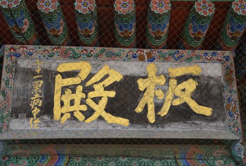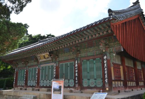 Juste à côté, se trouve Pan-jeon (Le Hall Tripitaka), bien culturel de Séoul ( en photo ci-dessous). Là sont entreposés les écritures bouddhistes (soutras). On peut trouver à l'intérieur de ce qui constitue le plus ancien bâtiment du temple, 3438 tablettes incluant le soutra Avatamsaka et dans un remarquable état de conservation. L'inscription à l'entrée (deuxième photo) est connue comme la dernière œuvre du calligraphe Jeonghee Kim, connu aussi sous son nom de plume, Chusa. Ce personnage naquit le 3 juin 1786 fut l'un des plus célèbres calligraphes sous l'ère Joseon. Il posséda près de 200 noms de plume car il fut aussi un fameux universitaire et épigraphe. C'est lui qui transforma l 'épigraphie coréenne et mit au point le style d'écriture Chusa. Ses peintures à l'encre représentant des orchidées sont aussi remarquables.
