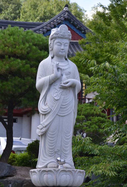 Pour terminer notre visite, nous nous arrêtons quelques instants près de la statue du dieu de la compassion (Haesu Gwaneum-sang) (ci-dessous). Gwanseum-bosal, le dieu de la compassion, est connu pour voir, entendre et sentir les souffrances. Il perçoit les cris de ceux qu'on ne peut pas entendre tout comme les plaintes des peuples et il les soulage de leurs souffrances. Le dieu de la compassion par l'eau ( cette statue est au milieu d'un petit bassin) est un symbole de foi tout particulièrement prisé en Corée. Cette statue se trouve en face du pavillon de la cloche conformément à la tradition. Le dieu tient dans sa main une bouteille de nectar tandis que le bouddha Amitabha est enchâssé dans la couronne du bodhisattva. Le petit bassin représente l'un des neuf bassins du paradis sauvegardé par le bouddha Amitabha, avec ses fleurs de lotus et ses poissons.
